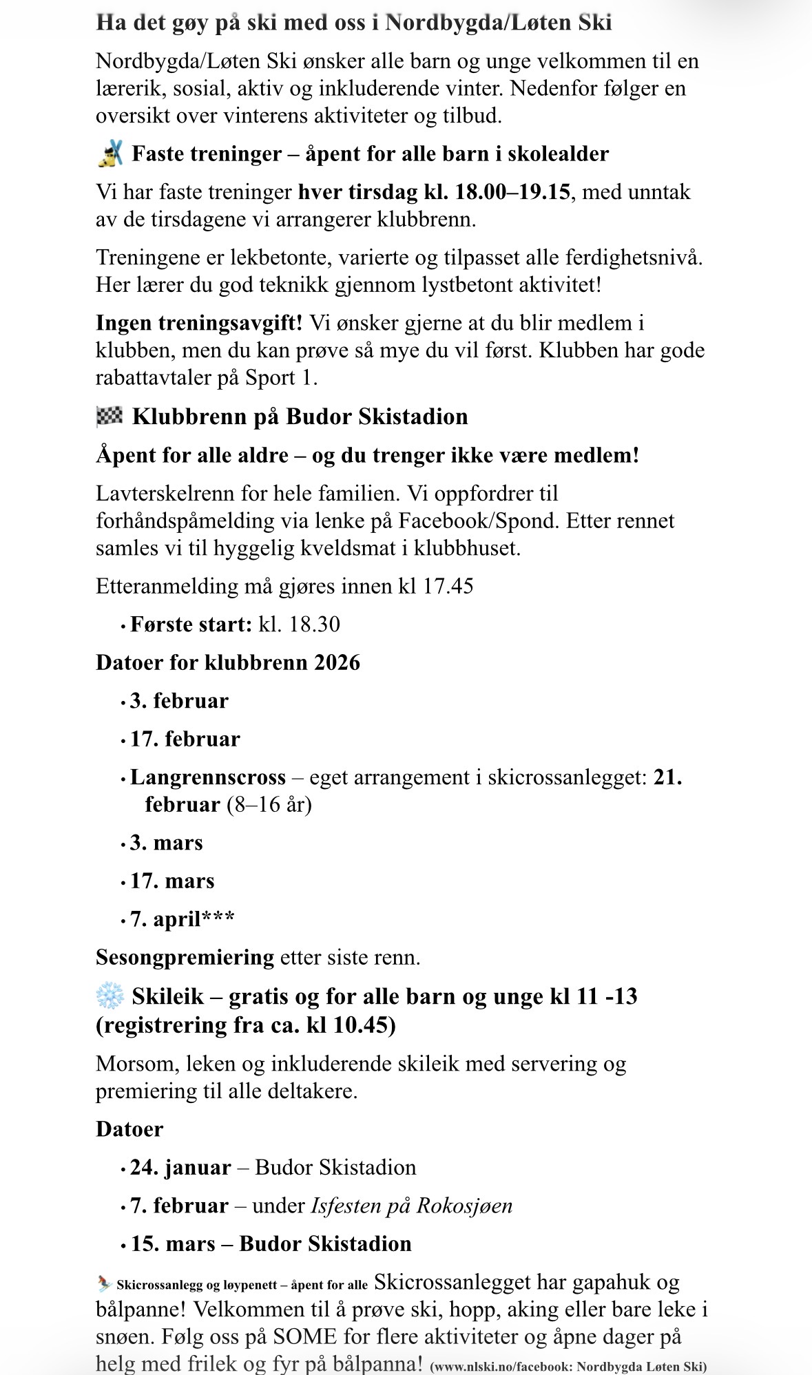 Treninger og klubbrenn 2026